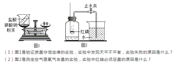 (1)实验装置未密闭,有碳酸钠与盐酸反应生成的二氧化碳逸出,导致左高右低 (2)足量的红磷保证将反应装置内空气中的氧气完全消耗