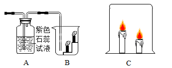这是制取并验证CO2性质性质的实验吧,A变色的原因应是石蕊试液变红,实验室CO2制法:CaCO3+2HCl=CaCl2+H2O+CO2↑ (2)二氧化碳密度比空气大(蜡烛自下而上熄灭),且不燃烧,也不支持燃烧。 (3)密闭容器中,蜡烛燃烧产生高温二氧化碳和水蒸气在容器上层聚集,而后下移,
