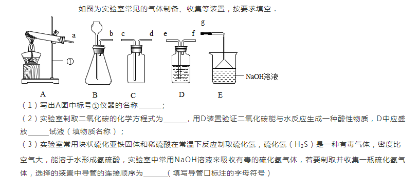 1.铁架台 2.CaCO3+ 2HCl = CaCl2+ CO2+ H2O 紫色石蕊溶液 3.befcdg