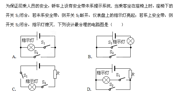 选择D,期中A也符合要求,但是考虑系安全带后灯熄灭,电路会短路,所以D中有个保护电路的电阻。