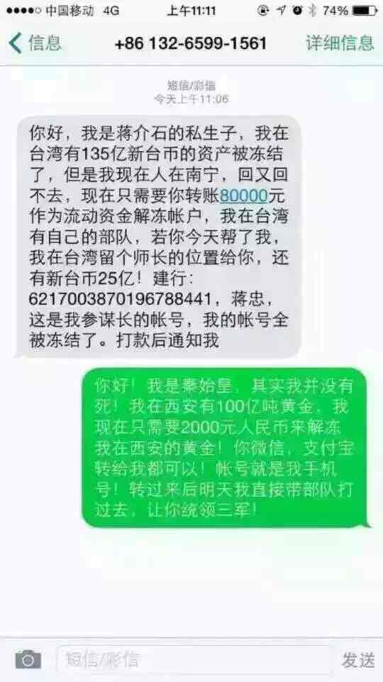 你好,秦始皇,我是汉武帝,其实我也没有死,你的100亿吨黄金已经被我挖了,被我分别藏在10000个地方,现在只要转给我999,就能获得一个藏宝地点,想挖宝的朋友赶紧行动起来吧。